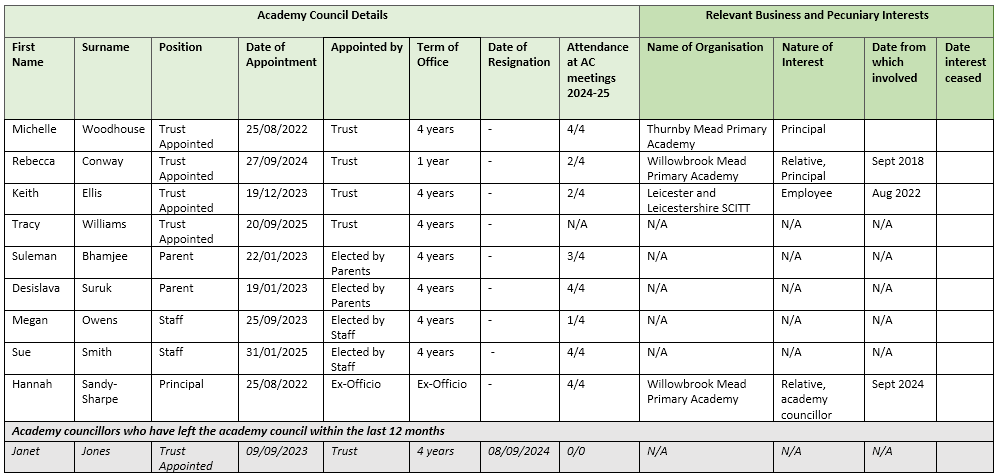The Academy Council holds the Principal and school senior leadership team to account for the educational performance of the school and its pupils.