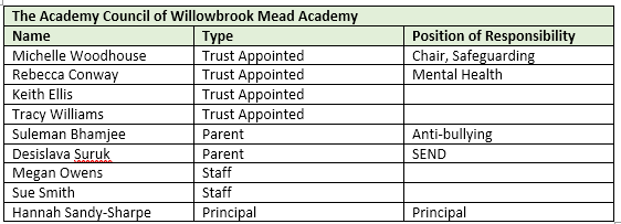 The Academy Council is made up of volunteers (known as academy councillors) who commit their time to work alongside the leadership team of the school to play an important part in raising school standards.